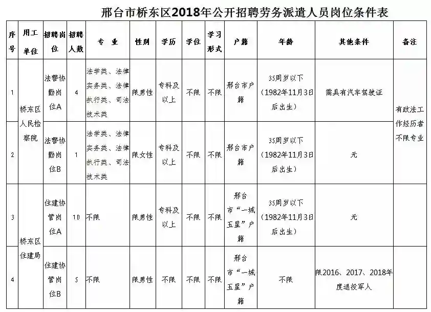 具体招聘人数和岗位条件详见《邢台市桥东区2018年公开招聘劳务派遣人员岗位条件表》(附件)。