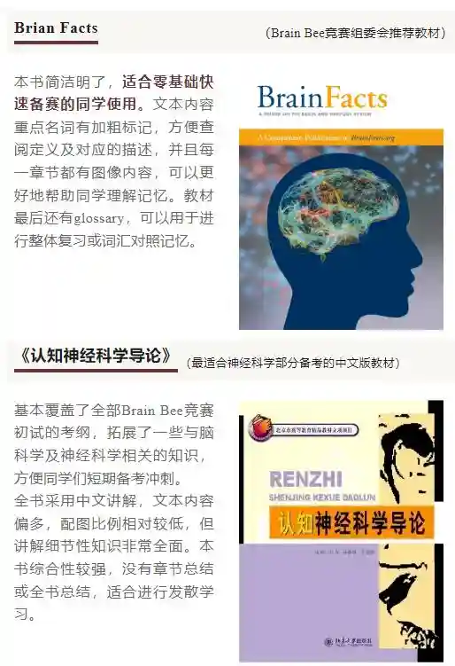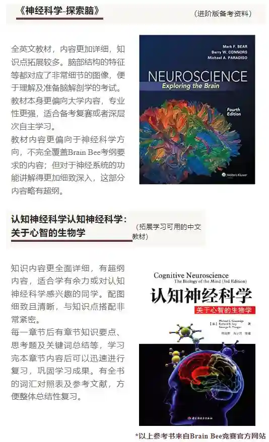 BrainBee组参考教材:《BrainFacts》,《认知神经科学导论》,《神经科学-探索脑》